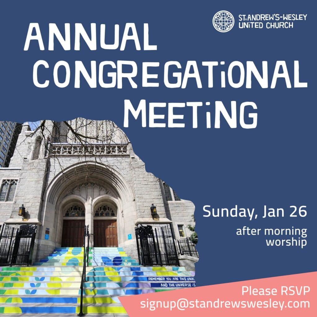 Sunday, Jan 26 after worship This meeting will take place in person, in the Sanctuary after worship. We are holding our ACM to approve the 2025 budget and taking nominations from the floor for the 2025-26 Board.