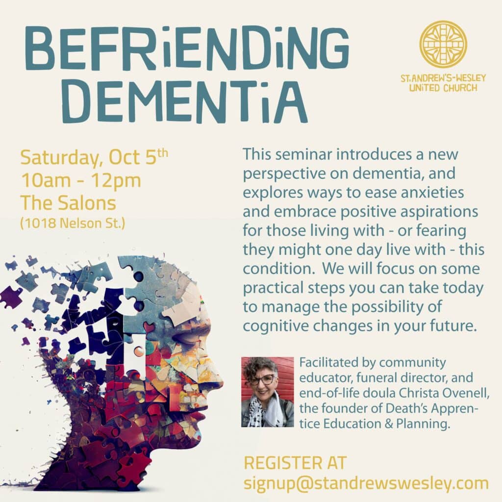 Facilitated by Community educator, funeral director, and end-of-life doula Christa Ovenell, the founder of Death’s Apprentice Education & Planning. Her heartfelt, practical approach to tackling difficult topics helps guide people toward inspiring life decisions. Christa was a monthly columnist on CBC’s North by Northwest, where she brought her signature warmth to all manner of discussions about end-of-life matters. Find her on Instagram (@deathsapprentice.ca) or on her website: www.deathsapprentice.ca