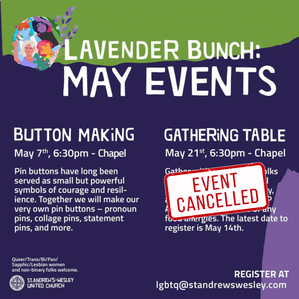 Pin buttons have long been served as small but powerful symbols of courage and resilience. They have been identifiers for community, and a way for folks to proudly declare their identities. Together we will make our very own pin buttons – pronoun pins, collage pins, statement pins, and more. Register at lgbtq@standrewswesley.com