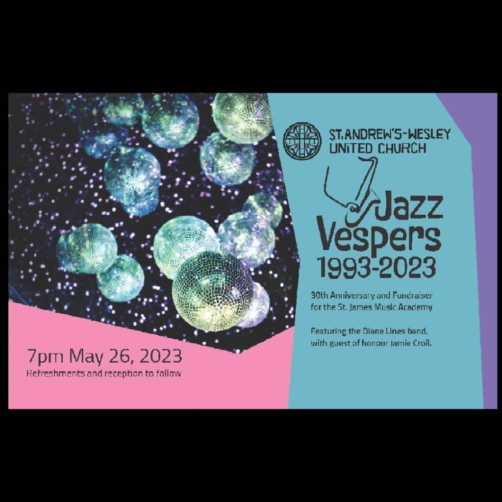 This event will be lead by the jazz ministries team of St. Andrew’s-Wesley, with messages from past and present clergy, musicians, and lay-folk who have been involved in this thriving ministry over the last 30 years. Music to be provided by the Diane Lines Trio (Diane Lines, voice and piano, Brent Gubbels on double bass, Buff Allen on drums), in connection with guest-of-honour Jamie Croil (voice, trumpet) who was the previous jazz vespers coordinator of over 14 years and a whole slew of guest artists!