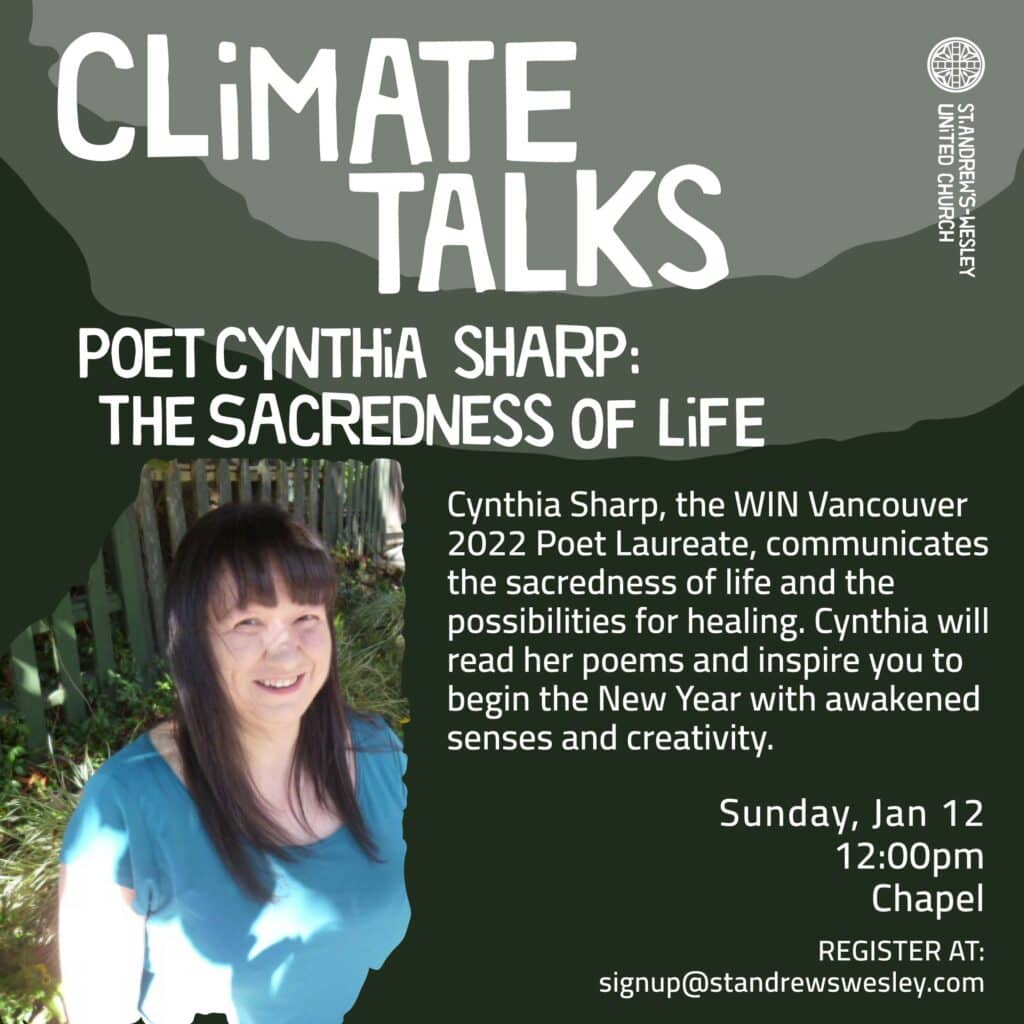 The poems of Cynthia Sharp, the WIN Vancouver 2022 Poet Laureate, communicate the sacredness of life and the possibilities for healing. Cynthia will read her poems and inspire you to begin the New Year with awakened senses and creativity.