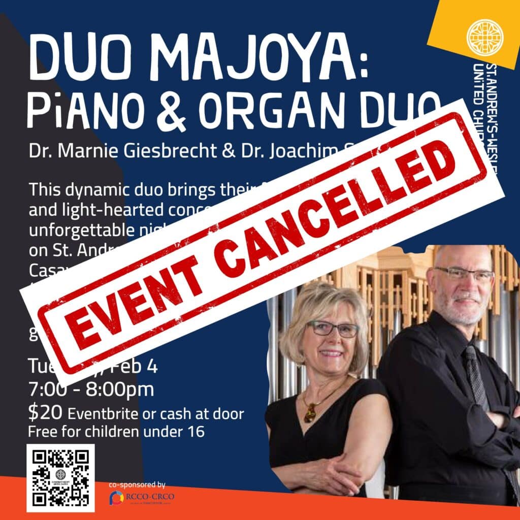 Duo Majoya is the husband-and-wife musical power couple of organist Marnie Giesbrecht and pianist Joachim Segger, the uniquely versatile and innovative keyboard team that has circled the globe performing keyboard duets of all combinations across North America, Europe, South Africa and Asia. Just in time for the Valentine’s season, this dynamic duo brings their fun and light-hearted concert to St. Andrew’s-Wesley for one unforgettable night, performing on our 4-manual Casavant Fréres organ (Opus 1475) and Steinway “Heirloom” concert grand piano.