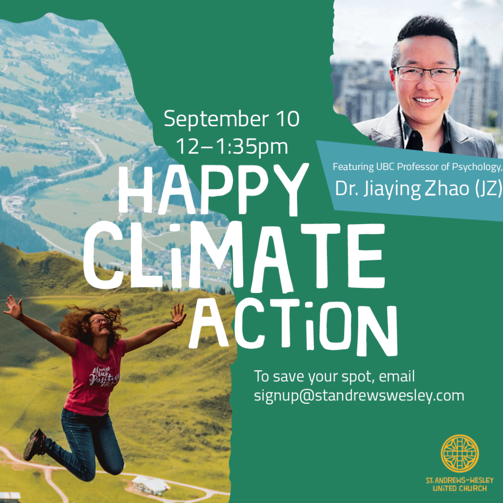 Do you want to find out how to be happier through climate action? UBC Professor of Psychology’s Dr. Jiaying Zhao (JZ) will speak about the Happy Climate Action approach and lead a workshop so that you can develop your own Climate Action Plan. This behavioural scientist has combined research about happiness and climate actions to help you be happier while saving the planet.