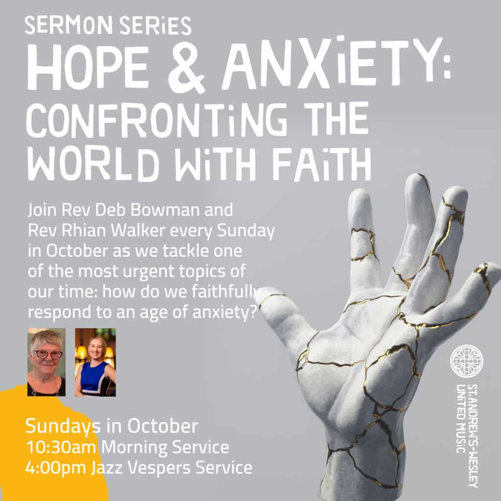 From economic systems to climate to geopolitical conflicts, there is a sense that everything is unstable and unsettled. Not surprisingly, people are reporting high levels of anxiety, anger and fear. How the heck do we find hope and joy that is meaningful and real in such a time as this? Join Rev Deb Bowman and Rev Rhian Walker every Sunday in October as we tackle one of the most urgent topics of our time: how do we faithfully respond to an age of anxiety?