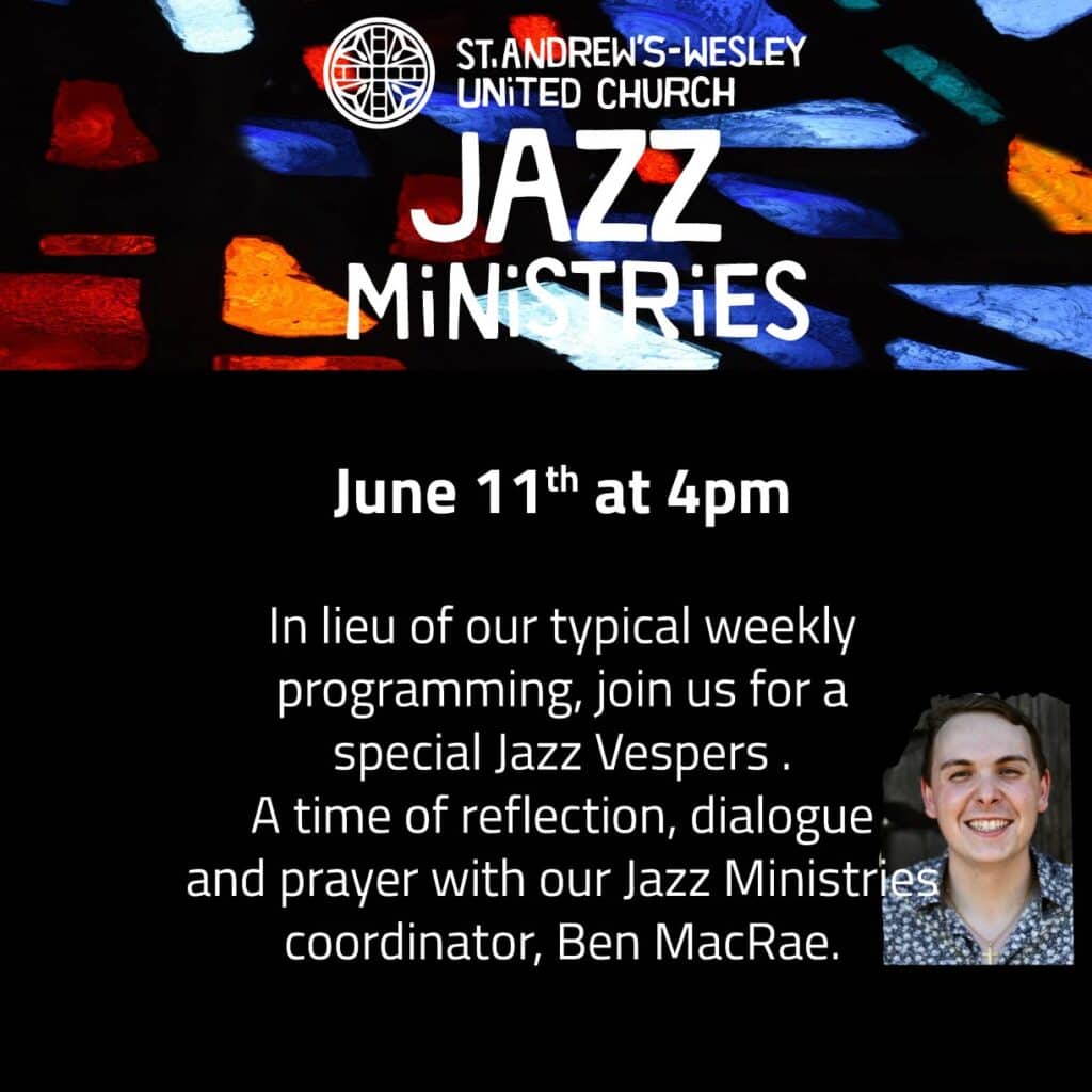 On June 11th we are excited to offer a time of reflection, dialogue, and prayer on the intersection of the jazz and spiritual traditions as practiced by the Christian community at St. Andrew’s-Wesley United Church in lieu of our typical weekly programming. This time of community reflection and conversation will be led by our very own Benjamin MacRae who serves as our jazz ministries coordinator and as minister with youth and young adults and is also a professional jazz musician in the Vancouver scene. This will be a space to bring your questions, curiosities, observations and experiences of the jazz vespers idiom into conversation with others from the community.