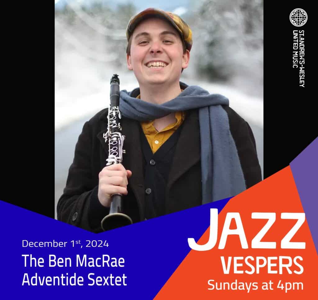 The Ben MacRae Adventide Sextet is a yearly ensemble that is directed by St. Andrew’s-Wesley’s own Jazz Ministries Coordinator, that seeks to explore the wisdom of the Christian tradition through offering original music that draws upon sacred and secular themes. The ensemble features some of Vancouver’s best musicians – people who Ben has called together for love of their art and the ways that they bring presence and gravitas to the jazz community of BC. All the music they play has been composed and arranged by Ben MacRae in spiritual offering, thanksgiving, contemplation and journeying with the Creator. As an ensemble and individual musicians, they acknowledge that they work, play, compose, improvise, live, and exist on the ancestral, unceded and stolen territories of the Coast Salish, Squamish, Musqueam, and Tsleil-Waututh peoples, and give further thanks to the Black American pioneers of the jazz idiom upon which they continue to expand and build.