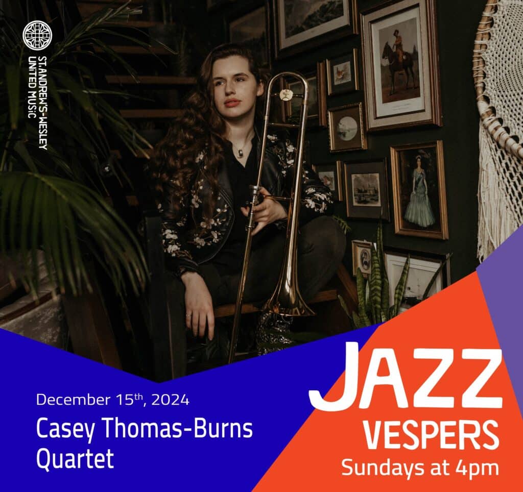 Trombonist and vocalist Casey Thomas-Burns returns to St.Andrews-Wesley, this time with her Jazz Quartet. You may have seen Casey at STAW before leading her Leading Ladies Little Big Band! For this festive performance, the quartet will be performing a selection of jazz standards and holiday favourites, perfect for the most wonderful time of the year. For more information on Casey and the band, visit www.caseythomasburns.ca