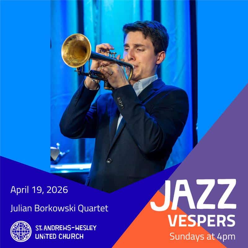 The Julian Borkowski Quartet is excited to be returning to St. Andrew’s Wesley to perform a collection of songs around themes of “community”. Their set will feature music written by legends of the jazz community, icons of the Canadian jazz landscape, and a couple originals by Julian himself that were written to be debuted at this very performance.