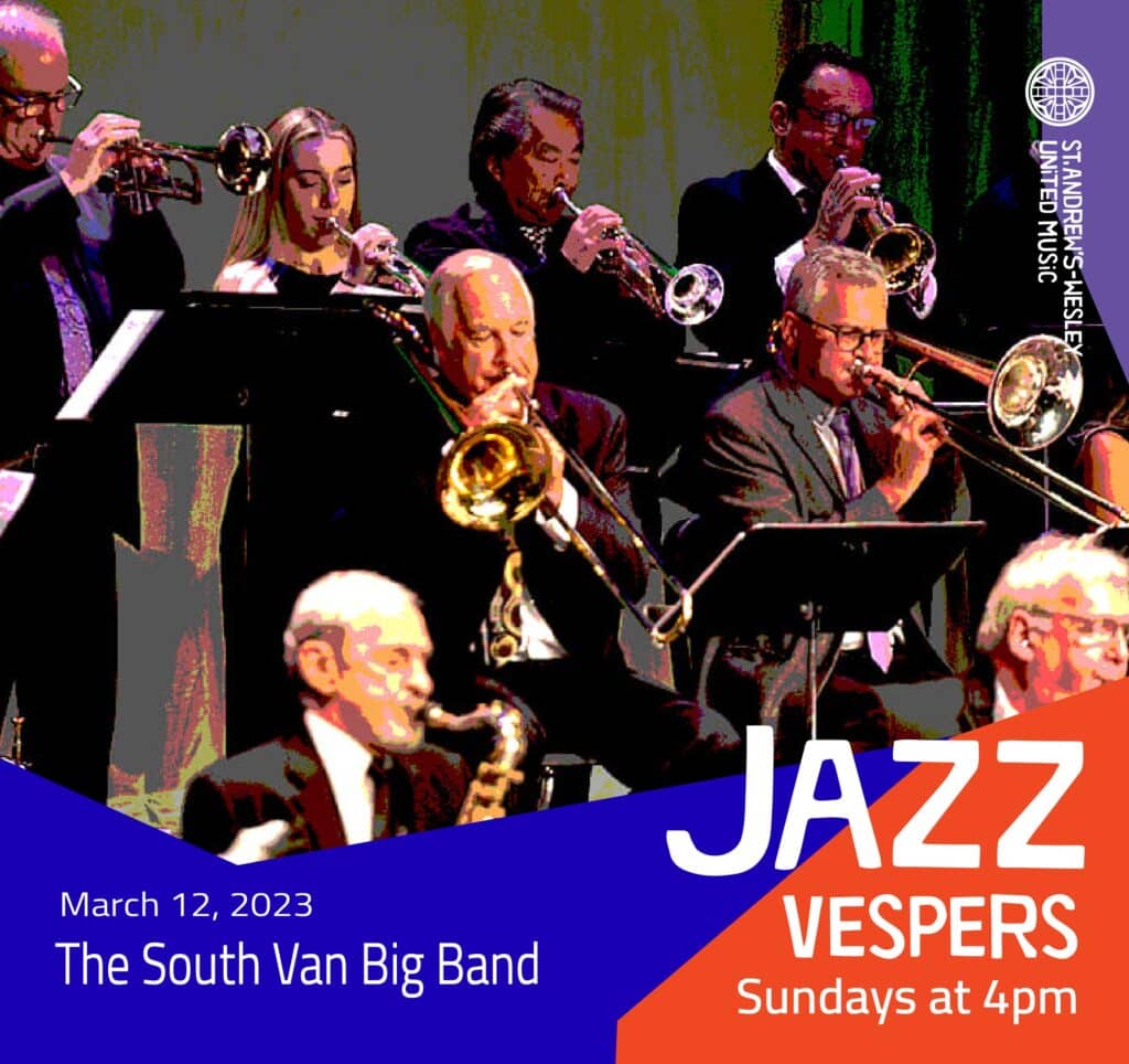 Join us this Sunday, March 12th at 4pm, where the spirit meets jazz. Featuring South Van Big Band.