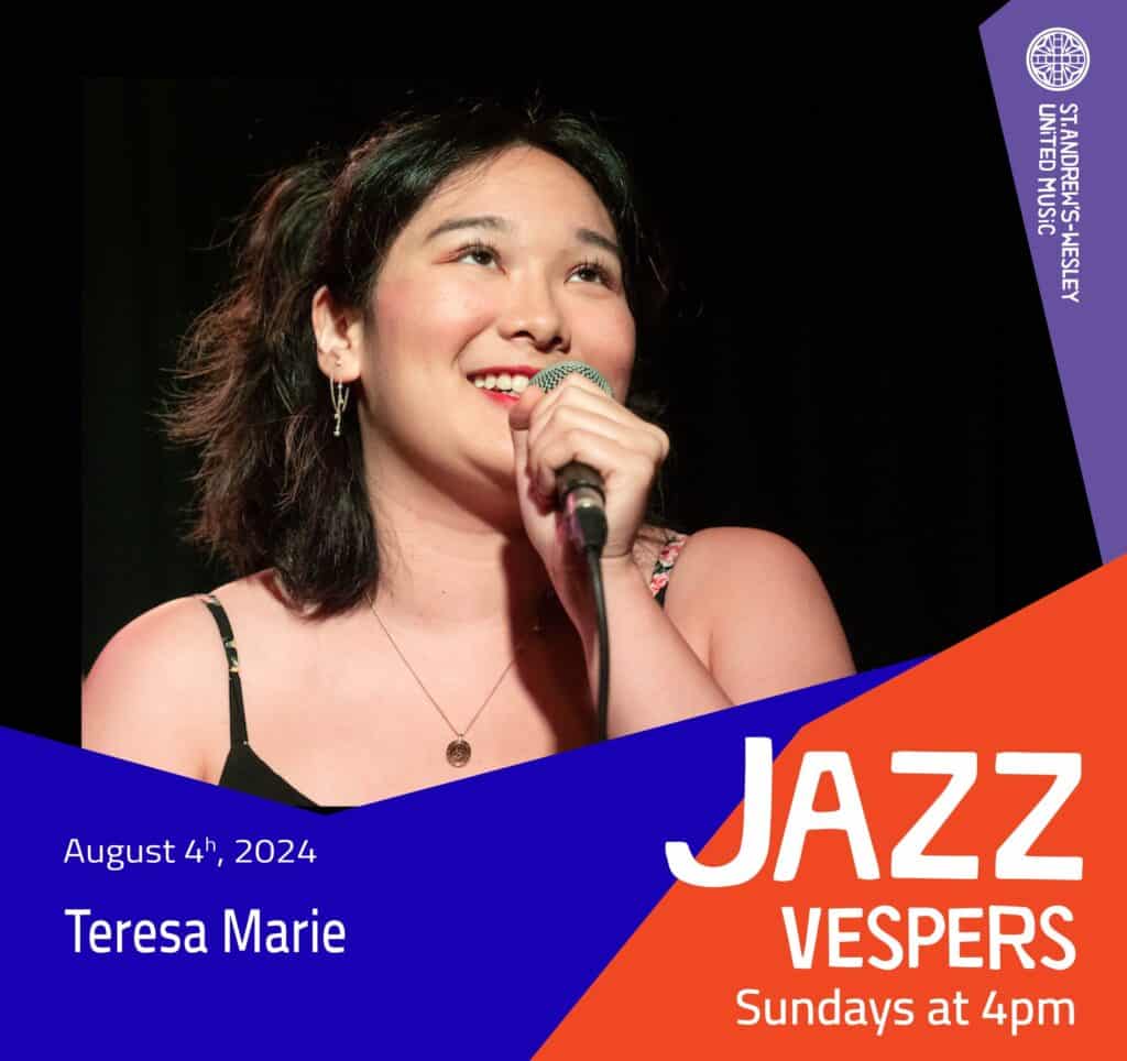 Join us on Sunday, August 4th at 4pm, where the spirit meets jazz Teresa Marie.