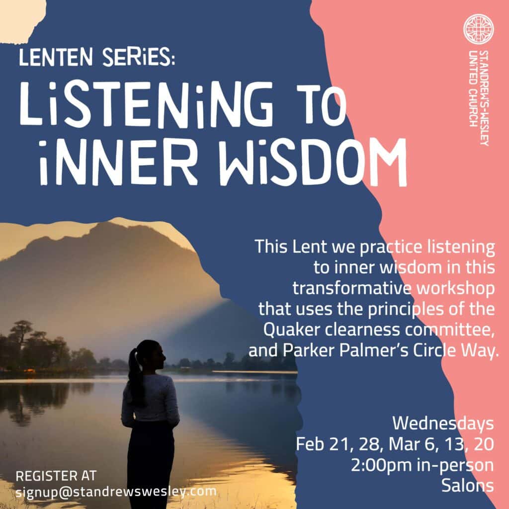 This Lent we practice listening to inner wisdom in this transformative workshop that uses the principles of the Quaker clearness committee, and Parker Palmer’s Circle Way to teach how we as a community can hold each other as we find our inner wisdom. Being in a small group can be a safe space where Spirit shows up and we can listen to our inner teacher. But we are often new or rusty to the practices of listening, sharing and staying present. In this simple but age-old process we will all learn to a) accompany each other in a way that is supportive but does not give advice, b) to remove the interferences to our own inner wisdom c) to listen to God more effectively and d) to hold ourselves accountable to God.