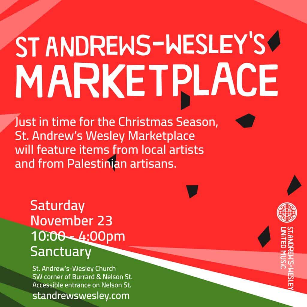 Just in time for the Christmas Season, St. Andrew’s Wesley Marketplace will feature items from local artists and from Palestinian artisans. Tables available for outside groups to purchase, please contact Jen Cunnings at j.cunnings@standrewswesley.com for more info.