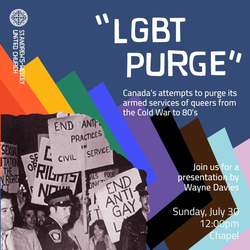 From the Cold War to the 80s, Canada attempted to purge its armed services of queer folx in a systematic campaign. Wayne Davies is one of those who was effected by the purge and now he is part of a group who are working to uncover that history. This fascinating presentation is free and open to all.