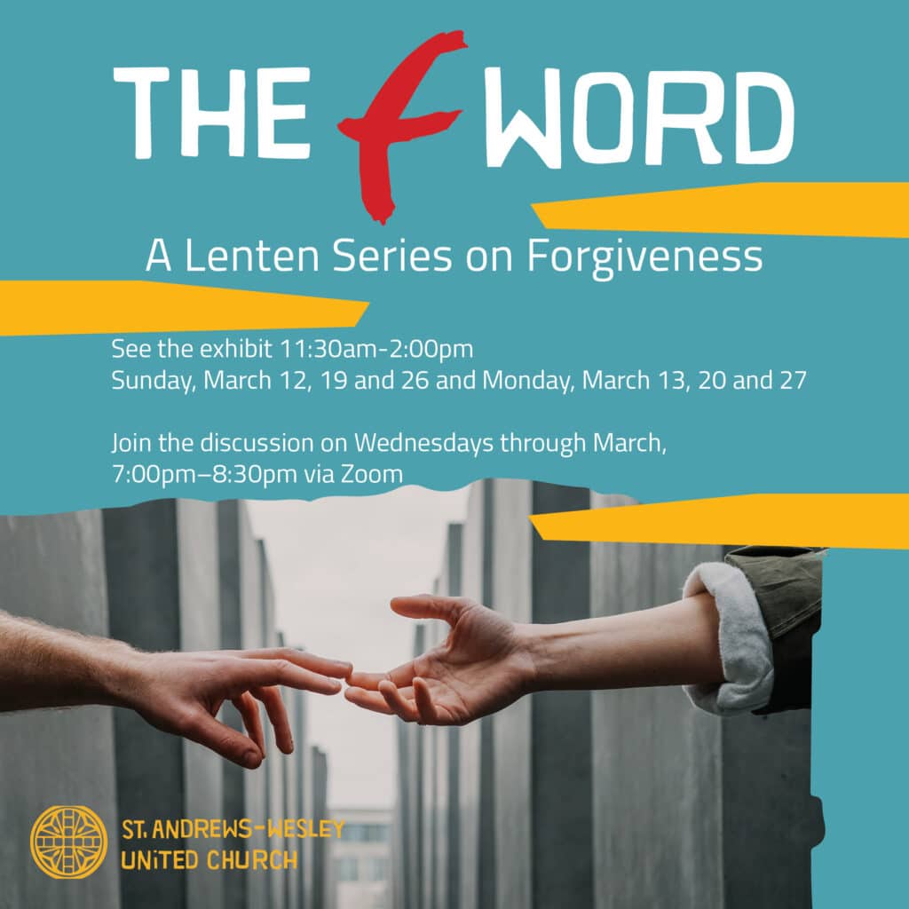 St. Andrew’s Wesley is also excited to host “The F-Word” art exhibit for the latter part of Lent. Visit the exhibit in the Sanctuary on Sundays, March 12, 19, and 26 and Mondays, 13, 20 and 27 from 11:30am-3pm. For more info on the Forgiveness Project visit https://www.theforgivenessproject.com/