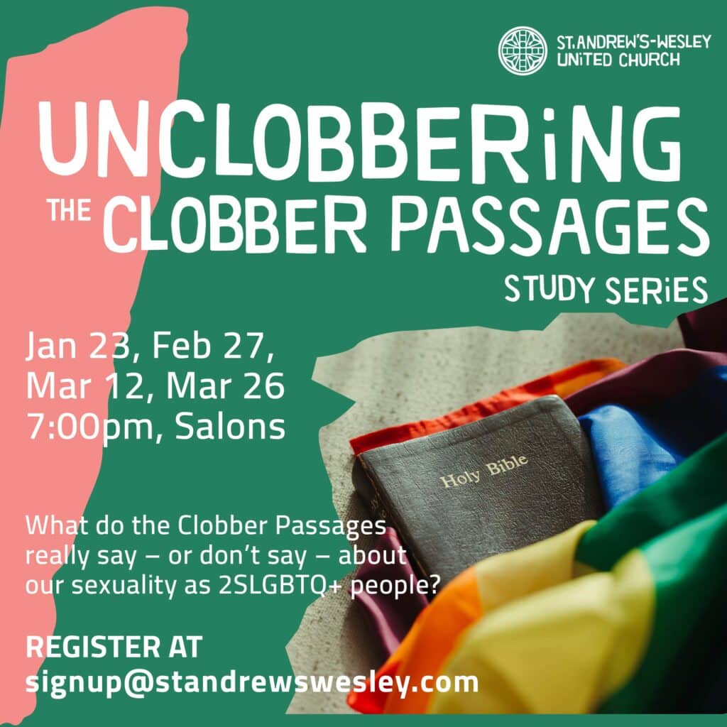 There are about 6 passages in the Bible that have historically been used to supposedly prove that homosexuality is a sin and an abomination to God. These are commonly called the Clobber Passages as they have been used to clobber and harm the lives of 2SLGBTQ+ people. But what do these verses really say – or don’t say – about our sexuality as 2SLGBTQ+ people? Starting on Jan 23 and continuing for a total of 4 sessions, we’ll dive into those passages and learn such things as why Sodom and Gomorrah were destroyed, the nature of the Levitical law and its purpose, and what Paul was actually talking about in Romans, I Corinthians, and I Timothy.