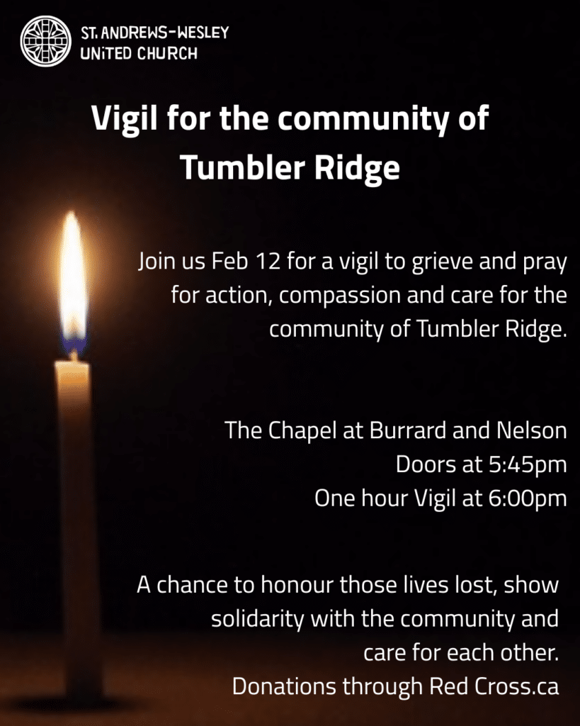 Join us for a vigil to grieve and pray for action, compassion and care for the community of Tumbler Ridge.