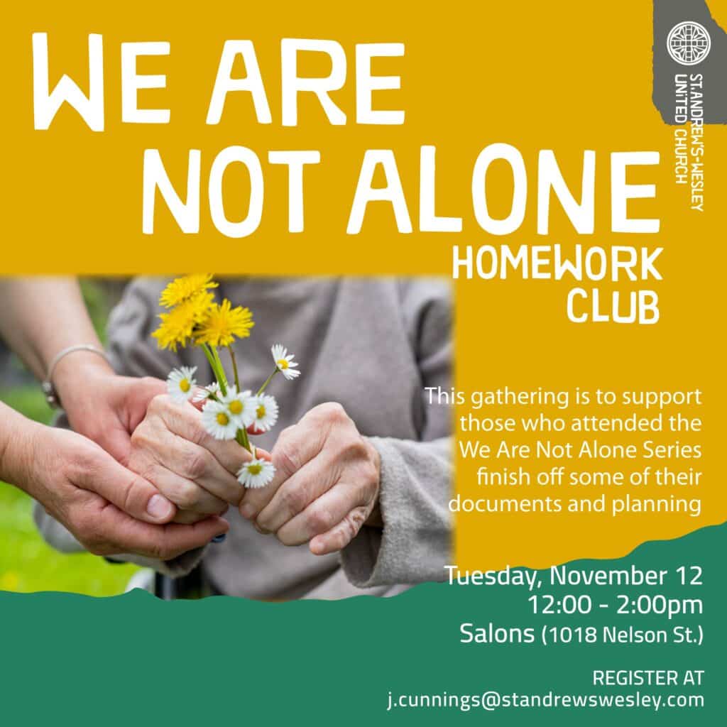 This gathering is to support those who attended the We Are Not Alone Series finish off some of their documents and planning.