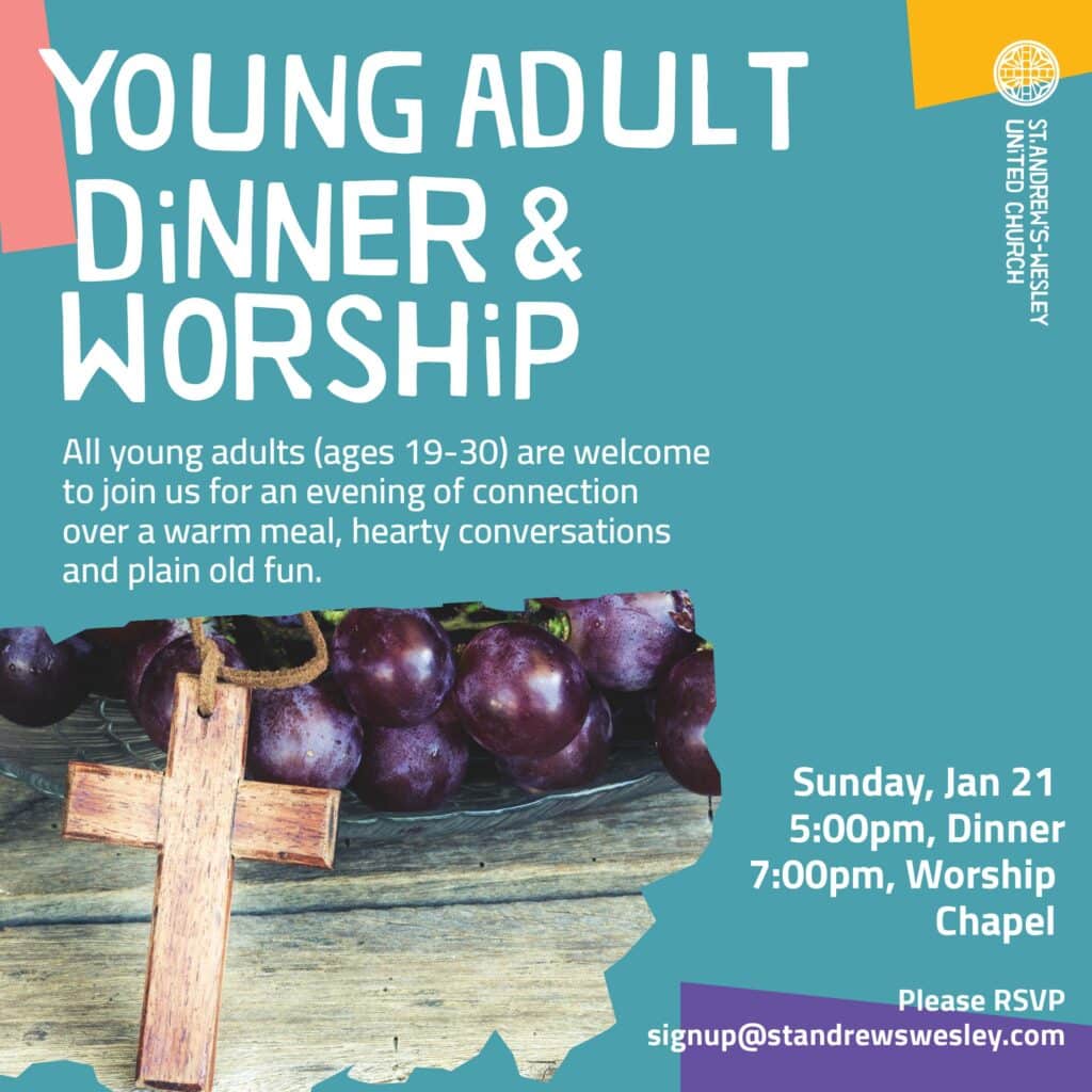 The journey of the soul craves connection and community as travel the many pathways of life. Walking alongside people at a similar age and place in life is essential to for personal, communal, and spiritual growth. All young adults (ages 19-30) are welcome to join us for an evening of connection over a warm meal, hearty conversations and plain old fun. Dinner at 5pm, contemplative worship at 7pm. Dinner provided by emailing your RSVP and dietary restrictions at signup@standrewswesley.com. All are welcome. Come as you are!